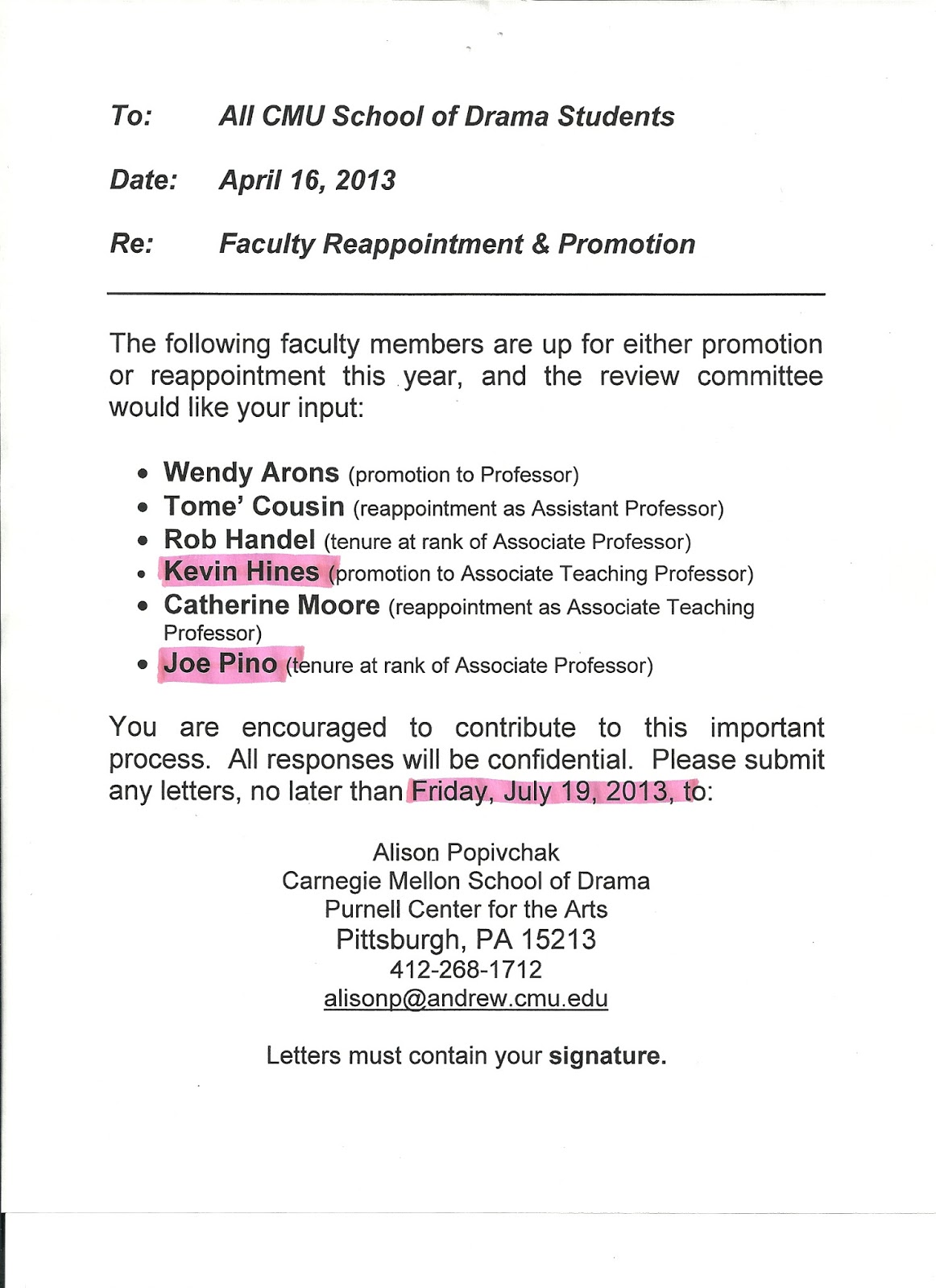 Awesome! I think these people, especially the ones that I have met, deserve everything they are getting. I do not quite understand the idea of tenure. I think it means that Joe can't be fired anymore. Which I'd imagine is a pretty good thing. I'm also incredibly happy for Kevin's promotion. I have no idea what is official title is at the moment or what the difference between Associate Teaching Professor and Associate Professor is but I'm still happy for him. The bottom of the letter I think encourages me to give input on whether or not I think these people deserve their promotions. This I will gladly do. And before the 19th.